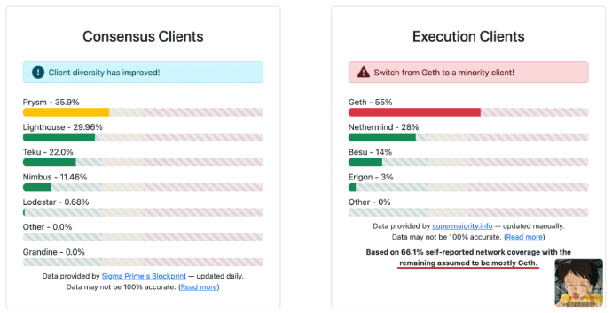 執(zhí)行客戶端的絕對多數(shù)存在嚴重風險,尤其是在發(fā)生故障時,可能導致網(wǎng)絡分離和共識失敗。這種情況會對整個生態(tài)系統(tǒng)產(chǎn)生負面影響,甚至影響Ethereum的廣泛采用。