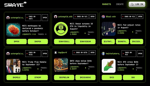 利用現(xiàn)有的社交媒體渠道是吸引更多用戶和提升預(yù)測市場參與度的有效方式。通過與Farcaster和Solana的Blink等平臺集成,預(yù)測市場可以利用已建立的網(wǎng)絡(luò)進行分發(fā)和用戶互動。像Swaye和Bookie這樣的項目已經(jīng)在朝這個方向發(fā)展,使用戶能夠直接在社交動態(tài)中分享他們的預(yù)測,創(chuàng)造病毒式傳播的時刻并推動參與。