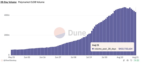 這些統計數據表明,用戶不僅使用Polymarket進行賭博,還可以觀察重大事件更準確的方向和賠率,這一說法也得到了DuneAnalytics的支持: