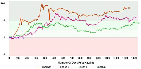 讓我們先來看看Bitcoin價格在過去幾個減半周期中的表現(xiàn)。很明顯,在減半后的第五個周期(2024年),Bitcoin的表現(xiàn)是減半以來最差的,也是唯一一個Bitcoin價格下跌的減半周期。