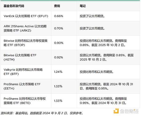 我們將Ethereum策略ETF定義為任何將至少50%的資產投資于以太幣期貨的ETF。目前市場上有七只此類基金,它們的費用從低到高依次列在下面。