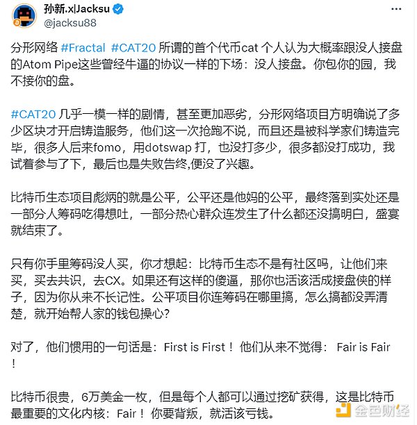 另一位KOL@123123crypto則認為,CATProtocol依附于一條Bitcoin的復(fù)制粘貼fork鏈FractalBitcoin,但它沒主流共識、沒代表項目,后面大概率也不會太大成就,其地位就相當(dāng)于Ethreumclassic,未來發(fā)展有限。而CAT20依附在這樣一條三無fork鏈,現(xiàn)在市值就1000萬美金了顯然不太合理。