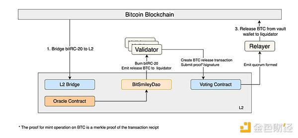 $bitUSD的運作機制和$DAI類似,首先是用戶超額抵押,然后在L2上的bitSmileyDAO在接收到預言機信息并進行共識驗證后,再向BTC主網發出MintbitRC-20的信息。
