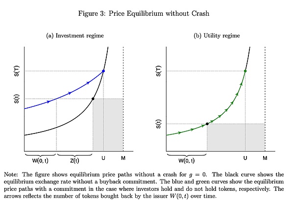 活動增長:假設交易平臺的活動以固定的增長率\(g 活動量:在沒有發生崩潰的情況下,平臺在時間\(t\)的活動量為 \(A(t)=e^{gt}\),否則\(A(t)\)接近于0。 此模型考慮了Tokens的效用需求和交易所為回購Tokens而投入的資源量如何與平臺活動成正比,進一步設定了交易所運行概率和違約強度,為理解交易所Tokens的市場動態提供了一個全面的分析框架。五、均衡分析 A.市場清算條件的圖形表示 在分析均衡結果之前,文章提供了市場清算條件的圖形表示。圖2展示了市場清算條件的機制,其中給定的X$(t)值由圖中的陰影矩形表示。向上傾斜的曲線代表了用戶向投資者和交易平臺提供Tokens的供給曲線。投資者和交易平臺持有的Tokens總量為W(0,t)+Z(t),用戶則持有剩余部分,即MW(0,t)Z(t)。用戶保持的美元余額為X$(t)。如果匯率上升,用戶愿意提供更多的Tokens,因為他們需要較少的Tokens來維持相同的美元余額X$(t)。這導致了匯率與投資用途Tokens數量之間關系的向上曲線。 B.有無投資者的均衡匯率 均衡匯率水平取決于平臺的回購承諾是否足夠大,能夠吸引投資者持有Tokens。要讓投資者持有Tokens,所需的回購資源隨著投資者預期回報的增加、平臺的失敗率上升而增加,隨著平臺增長率的增加而減少。 圖(a)顯示了當投資者選擇持有Tokens時,回購計劃下的均衡路徑;圖(b)則顯示了當投資者不持有Tokens,平臺僅從用戶手中回購時的均衡路徑。在g=0(平臺無增長)的情況下,黑色曲線未發生變化,匯率的變化完全由回購驅動。 推論1 在完全回購計劃中,如果Y$>(r+λg)X$,那么初始均衡匯率為 S(0)=1/M*Y$/(r+λg)。否則,初始均衡匯率為S(0)=X$/M。如果投資者持有Tokens,匯率的變化類似于戈登增長模型下持續增長的現金流估值。如果投資者不持有Tokens,初始匯率僅反映用戶需求與Tokens數量的比例。 六、平臺的回購計劃成本 A.資本成本與所需回報率之間的差距 本文利用模型評估交易所通過回購承諾籌集的額外資金與回購計劃預期成本之間的差異。交易所通過出售帶有回購承諾的Tokens獲得的資金,等于Tokens總量乘以均衡匯率。若沒有回購承諾,交易所出售Tokens的收入為X$,因此回購承諾帶來的增量收入為差額。C表示回購計劃整個期間的預期成本,這可以通過計算出整個計劃的折現成本來得出。 命題2 通過提供回購承諾,交易所能夠籌集的額外資金少于其預期的折現成本。 該命題表明,通過回購承諾籌集的資金成本高于投資者要求的回報率。因此,若交易所能夠通過更高效的資本市場以較低成本籌資,則應避免回購承諾。 B.價格操縱下的額外成本 通過回購承諾發行Tokens可能導致更高的成本,尤其是可能被大投資者通過“銷毀”Tokens(即永久凍結Tokens)來操縱價格。此時,平臺可能被迫無限期回購,推高Tokens價格。 1. 單一大投資者 命題3 如果一個大投資者持有用戶未持有的所有Tokens,則投資者可以銷毀部分Tokens,前提是某些條件成立。這使得Tokens價格上漲,回購速度放緩,最終導致平臺無法完成回購計劃,價格持續上漲。 2. 一個大投資者,多個小投資者 命題4 若最大投資者持有的Tokens比例達到一定水平,則銷毀部分Tokens對其有利。在這種情況下,即使有其他小投資者加入銷毀行動,最大的投資者仍能從中獲利。 3. 許多小投資者 當沒有單個投資者持有足夠的Tokens來進行操縱時,多個投資者可以通過合作銷毀Tokens獲利。這種合作通過Blockchain上的多重輸入交易可以實現,盡管在實際操作中協調多個投資者可能較為復雜。 4. 防止操縱 平臺可以通過限制回購承諾的Tokens數量來防止操縱。如果平臺承諾回購的Tokens數量超過Tokens總量的一半,則容易受到操縱。因此,許多平臺通常會限制回購承諾的比例在50%以內。七、具有投資動機的用戶 在本節中,討論了用戶對Tokens的需求受其價格升值率影響的情形,尤其是在回購計劃是全額回購時的情況。即便平臺只承諾少量資源用于回購,只要用戶有投資動機,回購承諾仍然會對Tokens價格產生影響,從而影響平臺通過Tokens銷售籌集的資金量。 命題5 當用戶的需求取決于Tokens升值率時,回購承諾的資源越多,用戶需求和平臺通過Tokens銷售籌集的資金也會越多。 例如,如果用戶的效用函數是對數函數,回購承諾的資源越多,初始均衡匯率就會越高。 八、結論 本文得出,回購承諾對加密交易所Tokens的價格動態有顯著影響,并且在某些情況下可能導致劇烈的價格波動。回購承諾是一種成本高昂的籌資方式,可能會被大投資者或多個小投資者利用。因此,回購承諾的存在通常表明平臺在傳統資本市場中面臨融資障礙。