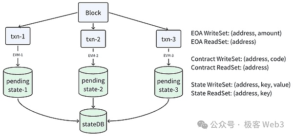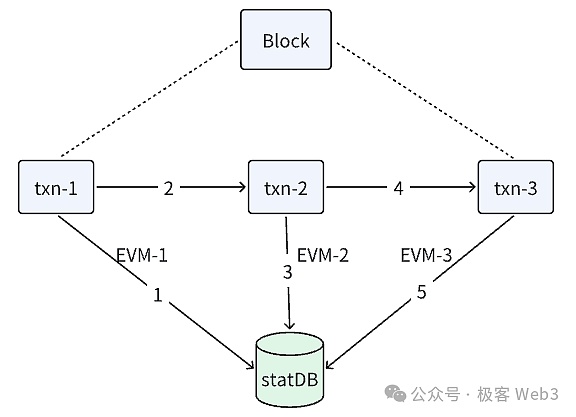 ·沖突檢測:在交易執行過程中,EVM會監測不同交易的ReadSet和WriteSet。如果發現多個交易嘗試讀寫相同的狀態項,則視為發生沖突。