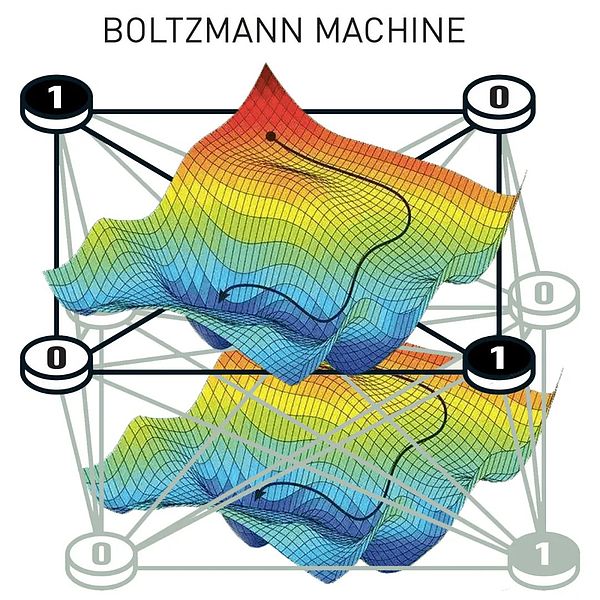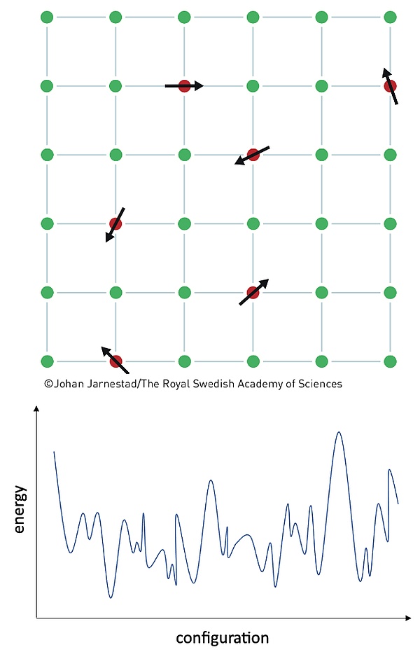 這張圖上方顯示了一個“自旋玻璃”,它內部的無序性構成了一種穩態,產生了下方所示的復雜的“能量地形”。