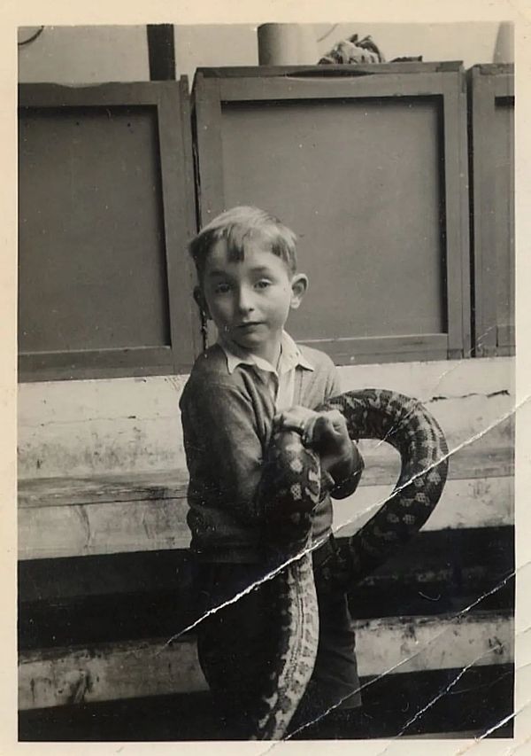 8歲的辛頓在動物園里和蟒蛇合影。