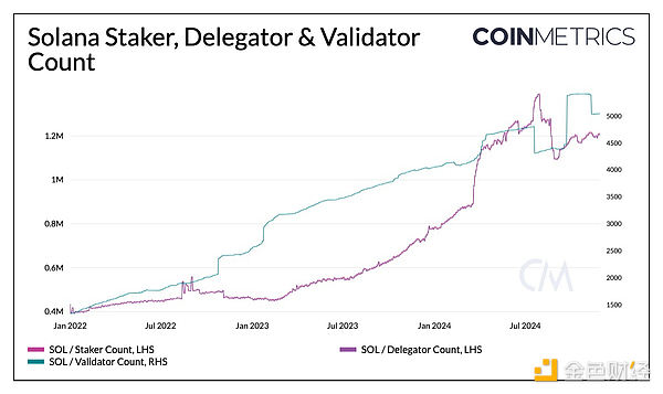 Ethereum擁有更大的驗(yàn)證者集,有107萬個(gè)驗(yàn)證者,而對(duì)硬件要求更高的Solana擁有5,048個(gè)驗(yàn)證者,但委托人超過121萬個(gè)。