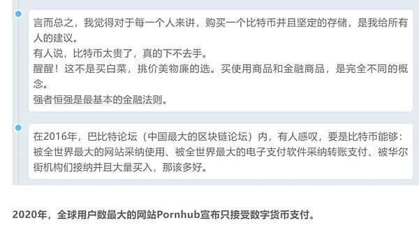 BTC的價值在宏觀領域,從金融史上類比債券、股票,是人類科技新一輪發展的“燃料”;中觀領域,是未來人類必然進入的數字世界的貨幣、也是指數;微觀領域,則是新一輪法律監管落地,發幣合規化,從而虹吸全世界民間投資需求。