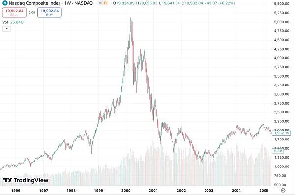 以及,回看當年波起云涌,也被眾多媒體詬病“泡沫”的互聯網行業。今天,納斯達克指數突破了20000點大關。回過頭看,2000年的它,當時看似山峰,現在,不過是一個小山包罷了。就算在2000年躬身入局互聯網行業,堅持到今天,依然幾乎是最正確的選擇。