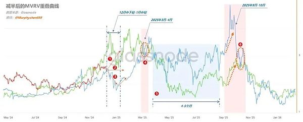 6、在2025年9月-10月還有本輪周期的最后一波行情(如圖中標注6),在這個階段的初期,綠線和藍線出現(xiàn)較大的分離。如果屆時紅線靠近藍線,那么這波行情的高點會比3-4月的峰值更高;如紅線靠近綠線,則高點會低于3-4月的峰值。