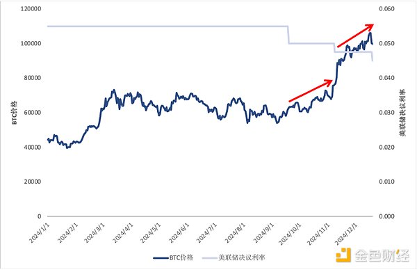 圖13:2024年BTC價(jià)格與美聯(lián)儲(chǔ)決議利率