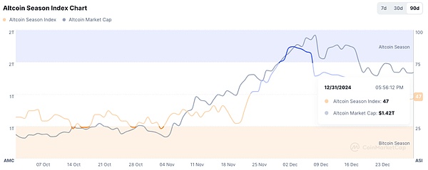 當前AltcoinSeasonIndex為47,前值為46;