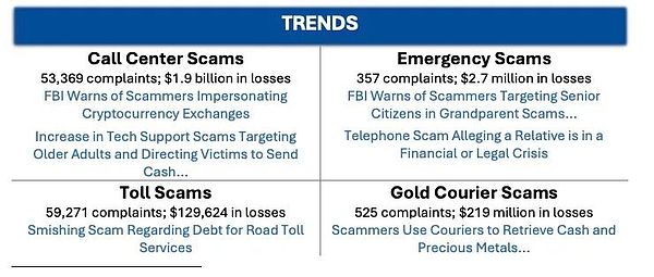 2024年,IC3收到333,981起網(wǎng)絡(luò)詐騙投訴,造成137億美元損失,占全年總損失的83%。主要交易方式包括Crypto、電匯、信用卡支付等。