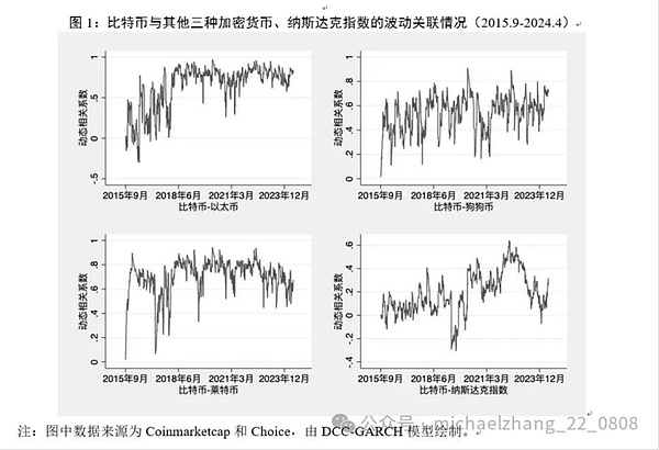 由于具有較高的流動性和市場占有率,Bitcoin在整體Crypto市場的波動傳染現象中發揮著核心作用。一方面,作為Crypto市場波動溢出的主要貢獻者,Bitcoin對新聞事件的敏感性和快速反應往往會帶動其他小型Crypto的價格波動(Koutmos,2018;Moratis,2021);另一方面,加密市場內部存在顯著的收益共同跳躍現象,表明Crypto的多樣化并未有效降低波動風險(Yue等,2021)。更為關鍵的是,Bitcoin與以太幣、狗狗幣等主要Crypto之間的長期高同步波動水平進一步放大了市場的系統性風險(見圖1)。此外,觀察Bitcoin與美國納斯達克指數之間的波動傳染趨勢可以看到,在2020年底美國推出大力度的刺激措施后,兩者的波動相關性顯著增強,表明Crypto給金融市場的穩定性帶來了額外壓力。