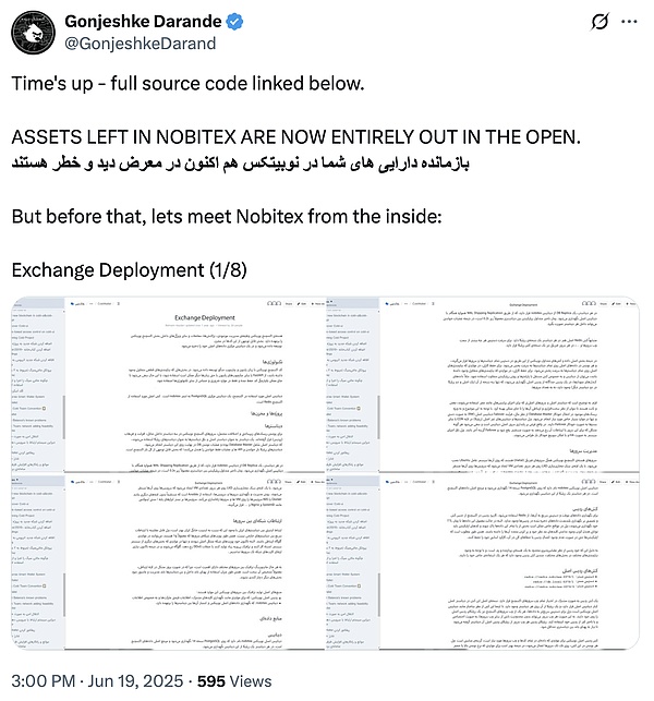 2025年6月18日,鏈上偵探ZachXBT披露,伊朗最大的加密交易平臺Nobitex疑似遭遇黑客攻擊,涉及多條公鏈的大額資產(chǎn)異常轉(zhuǎn)移。