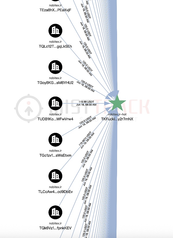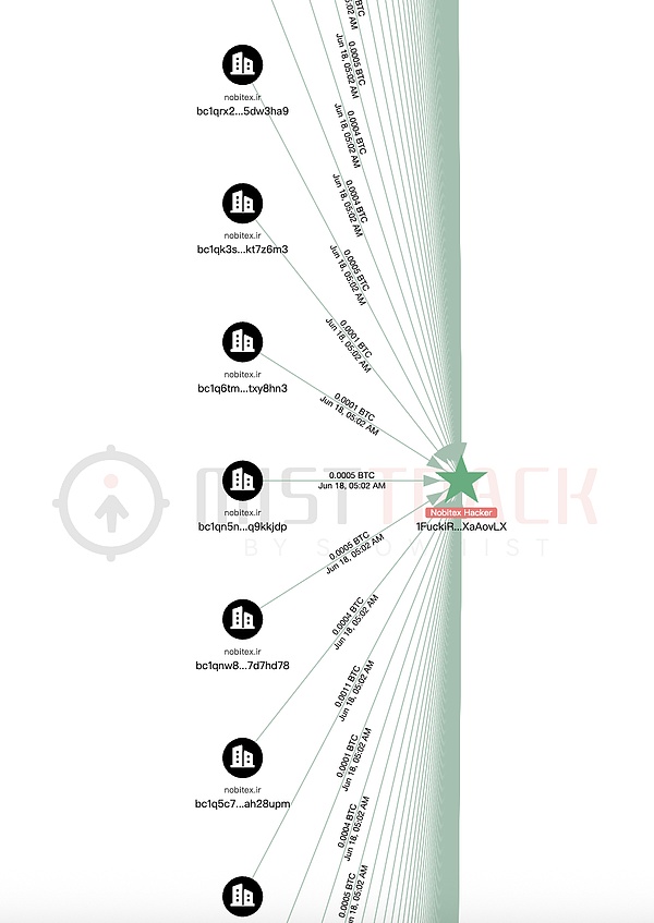 我們使用鏈上反*洗*錢與追蹤工具M(jìn)istTrack進(jìn)行分析,Nobitex的損失不完全統(tǒng)計(jì)如下: