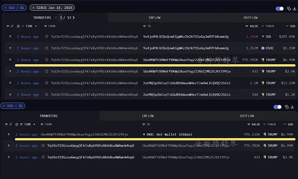 據報道TRUMP團隊昨日向Binance和OKX發送了227.7萬枚TRUMP(約合2050萬美元)、125萬枚USDC和1,292枚SOL(約合18.7萬美元)。