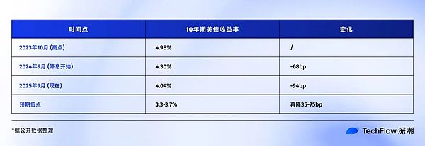 換算成價格,如果10年期美債收益率再降50個基點到3.5%左右,持有10年期國債的投資者還能獲得約5%的資本利得。對債券投資者來說不錯,但對習慣了動輒翻倍的加密玩家,可能會覺得收益較低。