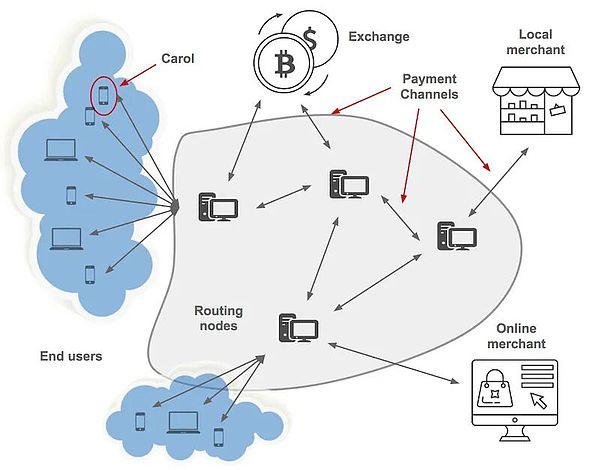 這些通道可以相互連接。如果愛麗絲與鮑勃有通道,鮑勃與卡羅爾有通道,愛麗絲可以通過鮑勃向卡羅爾支付。網絡將形成一個互聯的支付通道系統,處理即時、低費用的交易。