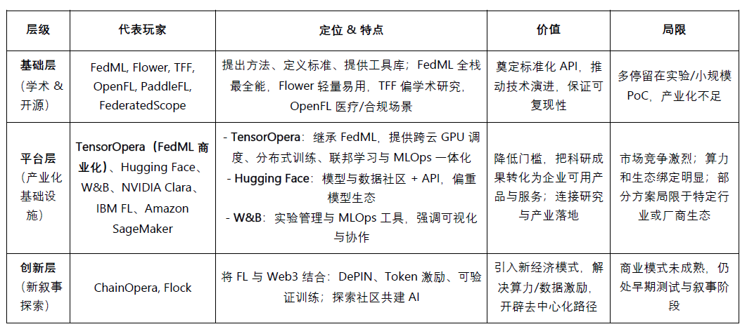 在產(chǎn)業(yè)化與基礎(chǔ)設(shè)施層,TensorOpera(FedML商業(yè)化)的特點(diǎn)在于繼承開(kāi)源FedML的技術(shù)積累,提供跨云GPU調(diào)度、分布式訓(xùn)練、聯(lián)邦學(xué)習(xí)與MLOps的一體化能力,目標(biāo)是橋接學(xué)術(shù)研究與產(chǎn)業(yè)應(yīng)用,服務(wù)開(kāi)發(fā)者、中小企業(yè)及Web3/DePIN生態(tài)。總體來(lái)看,TensorOpera相當(dāng)于“開(kāi)源FedML的HuggingFace+W&B合體”,在全棧分布式訓(xùn)練和聯(lián)邦學(xué)習(xí)能力上更完整、通用,區(qū)別于以社區(qū)、工具或單一行業(yè)為核心的其他平臺(tái)。