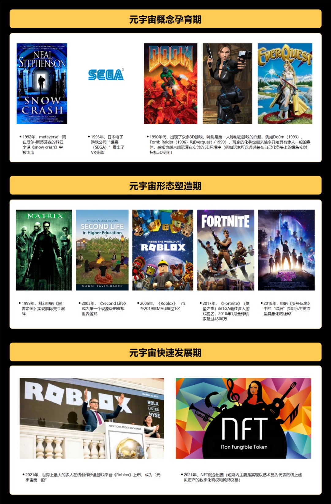 90年代還出現(xiàn)了眾多3D游戲,玩家的化身也越來越多開始具有像人一般的身體,感知也越來越沉浸在實(shí)時(shí)的3D環(huán)境中。赫胥黎想象中的設(shè)備(商業(yè)VR)也是在這個(gè)時(shí)候出現(xiàn)。此時(shí)元宇宙的概念雖未被提出,但什么是元宇宙似乎已逐漸明了,就是讓人們能夠在虛擬世界中享受沉浸式體驗(yàn)。而后《黑客帝國》和《頭號玩家》,則把這種真實(shí)世界與虛擬世界的交互通過大熒屏演示了出來,后者構(gòu)建出的“綠洲”,其實(shí)非常接近當(dāng)下提出的元宇宙概念了。而真正將元宇宙概念推向高潮,是2021年。有兩件標(biāo)志性事件,Roblox上市,成為“元宇宙第一股”,以及NFT(Non Fungible Token,即非同質(zhì)化Tokens)出圈。