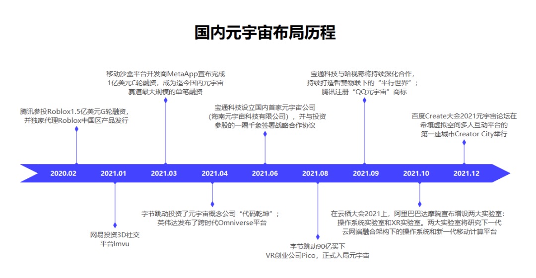 國內(nèi)企業(yè),主要是互聯(lián)網(wǎng)大廠,2020年就開始爭相布局,比如:騰訊參投Roblox,網(wǎng)易投資Imvu,字節(jié)跳動買下Pico,阿里達(dá)摩院增設(shè)操作系統(tǒng)實(shí)驗(yàn)室和XR實(shí)驗(yàn)室,百度甚至直接把Create大會開在了希壤虛擬空間......