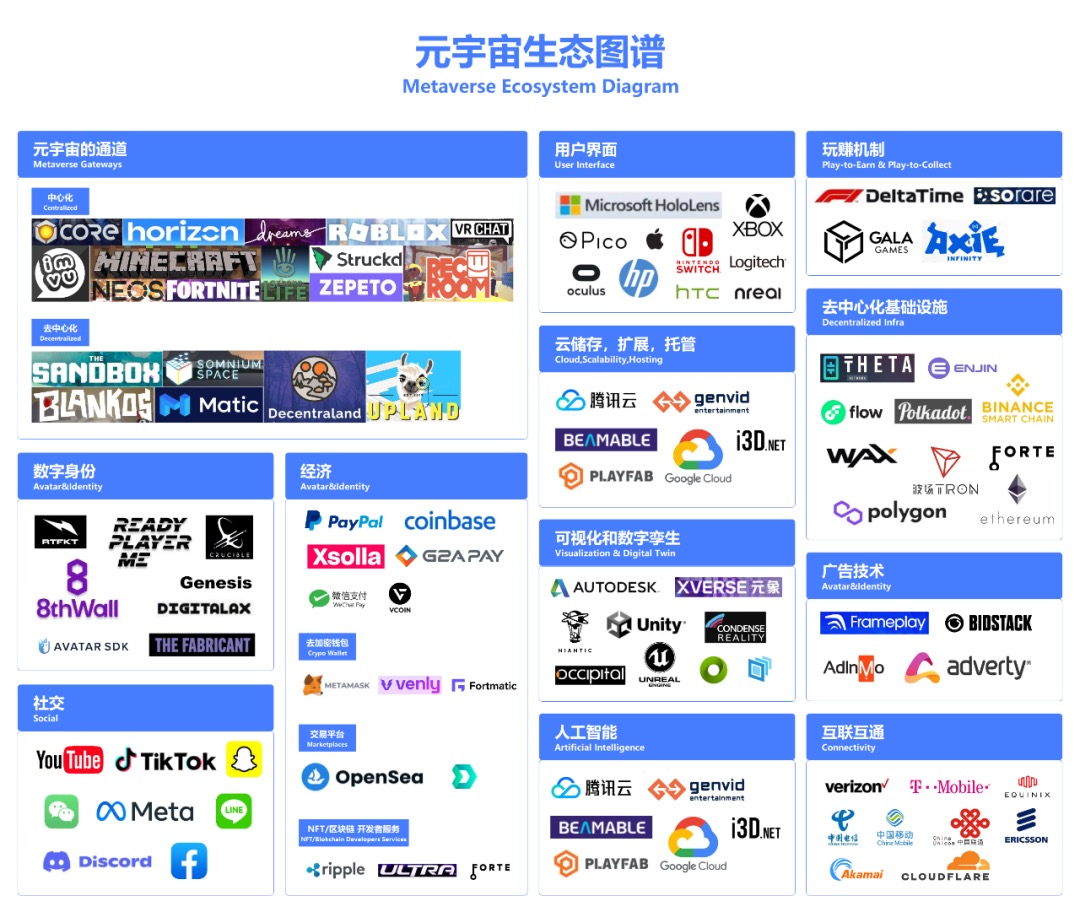 前面提到的企業(yè)更多是主動布局元宇宙,但還有更多企業(yè),早在元宇宙概念出現(xiàn)前就已經(jīng)在做基礎(chǔ)建設(shè)了,比如云儲存、人工智能、操作系統(tǒng)、支付系統(tǒng)、Decentralization交易所、5G網(wǎng)絡(luò)等等。