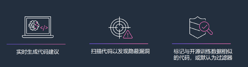 CodeWhisperer是一款可以通過使用引擎蓋下的FM根據(jù)開發(fā)人員的自然語言評論和IDE中的先前代碼實(shí)時生成代碼建議的AI編碼伴侶,可以顯著提高開發(fā)人員的效率。該工具目前提供十余種開發(fā)語言,如Python、Java、JavaScript、TypeScript、C#、Go、Kotlin、Rust、PHP和SQL等,并且可以通過在VS Code、IntelliJ IDEA、Amazon Cloud9等集成開發(fā)環(huán)境中的Amazon Toolkit插件進(jìn)行訪問。此外,CodeWhisperer利用亞馬遜云科技在安全方面的積累來掃描各種安全問題,能夠自動掃描代碼中的安全漏洞并幫助用戶修復(fù),從而增強(qiáng)代碼的安全性。