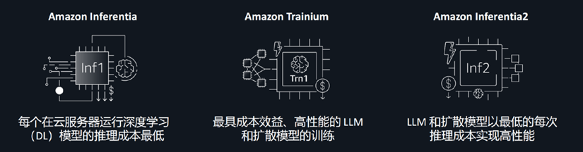 提供兩款專門針對生成式 AI 優(yōu)化的高性價比虛擬機(jī)實(shí)例 EC2 Trn1n 和 EC2 Inf2,這兩款實(shí)例基于自研 AI 訓(xùn)練 (Trainium) 與推理芯片 (Inferentia),能夠大幅節(jié)省企業(yè)的生成式 AI 訓(xùn)練和推理成本;