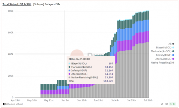 根據Dune Analytics的數據,到2024年,存入流動質押衍生品的SOL總量將增加一倍多。從6月1日到7月26日,質押的LST數量從163,827增加到807,712,增長了393%。