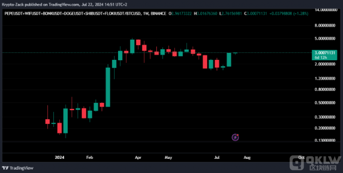 與此同時(shí),著名模因幣交易員扎克·文圖拉(Zack Ventura)表示,更廣泛的模因幣行業(yè)可能有望進(jìn)入牛市周期的下一階段。交易員在7月22日的X帖子中寫道:“該指數(shù)顯示了截至2023年12月與Bitcoin相比排名靠前的模因幣。下一個(gè)模因幣季節(jié)即將到來。”
